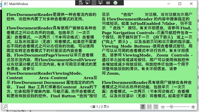FlowDocumentReader是提供一种查看流内容的控件,该控件内置了对多种查看模式的支持。