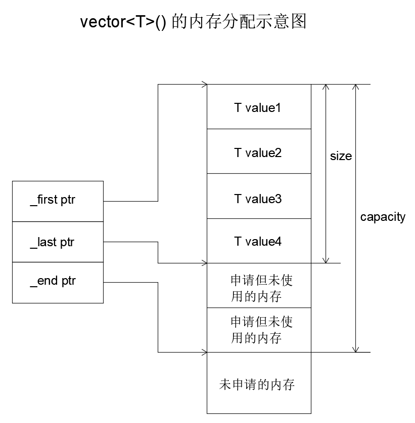 vector内部维护三个指针,_first ptr指向第一个元素,_last ptr指向最后一个元素的下一个位置,_end ptr指向vector指向其申请内存的下一个位置。因此vector的size就是等于_last - _first,而capacity就等于_end - _first。