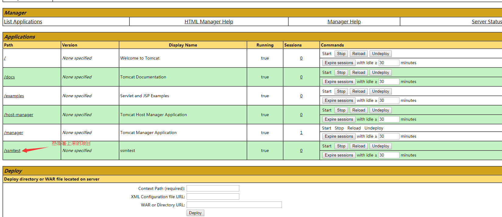 等待部署完成访问项目http://192.168.1.110:10000/ssmtest发现可以正常使用,部署成功。同时在tomcat管理页面就可以发现已经部署的项目如图: