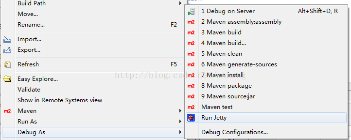 3. 在Debug下运行jetty,这样maven工程即可支持热部署,又可以支持调试;使用mvn jetty:run也可实现热部署,但是调试时总是找不到源代码,即使是自己编写的类也找不到,所以就没有使用那种方式,直接用run jetty的方式部署maven-web项目;