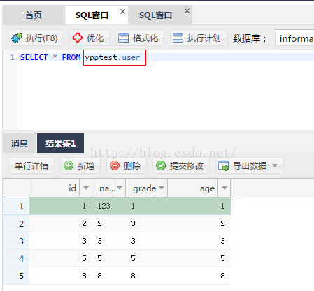 ypptest数据库名,user是创建的表名