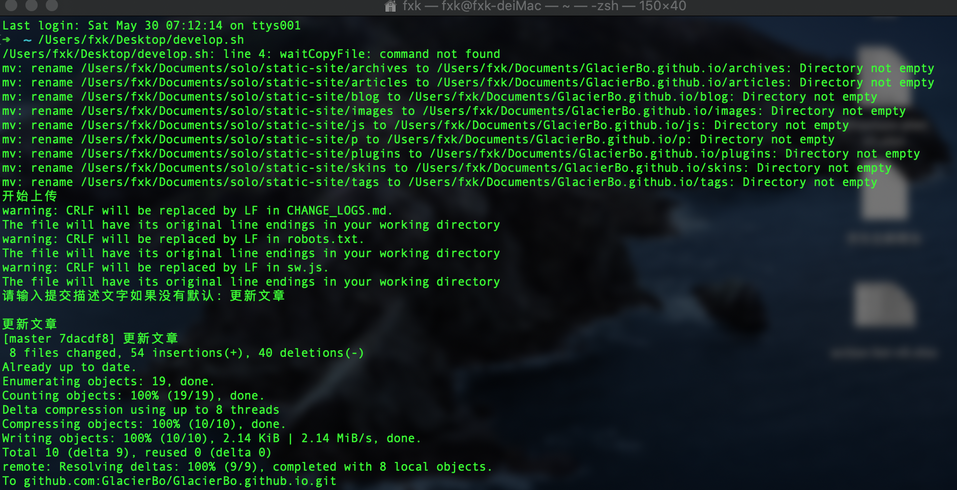 这边提供一个自用的小脚本,主要作用是将 static-site 中生成的静态文件拷贝到本地仓库,然后通过本地仓库上传到 github ,可以很快的实现部署。