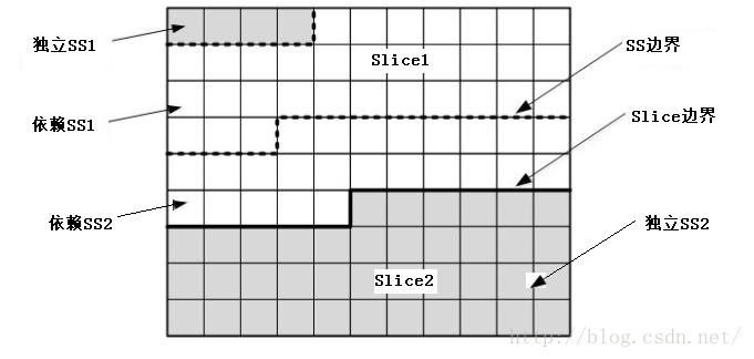 如图Slice以独立SS作为开始,一个SS包含整数个CTU(至少一个)。预测过程不可以跨越Slice边界,但是可以跨越依赖SS边界,一个Slice中的SS之间可以相互参考。