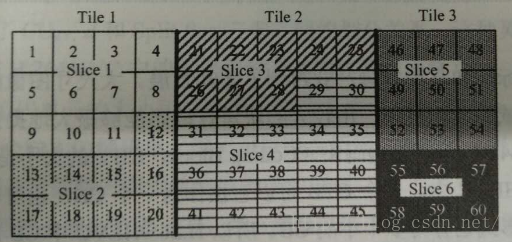如下图,一幅图像在垂直方向被划分为三个Tile,这三个Tile中各自的所有CTU都属于同一个Slice。