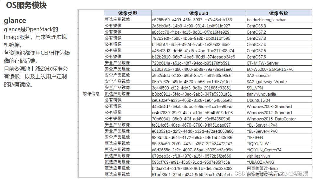 | 镜像服务 | Glance | 提供虚机镜像的服务; |