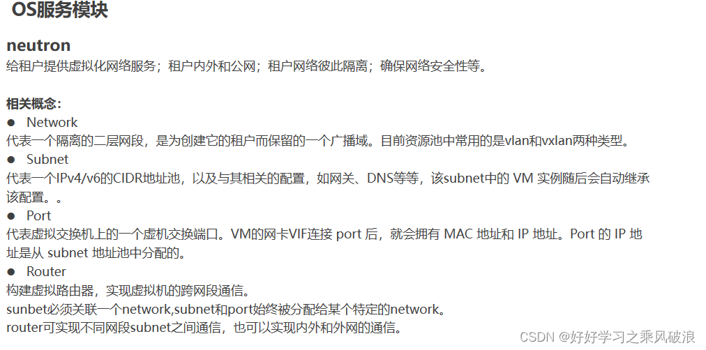 | 网络 | Neutron | 为租户提供网络服务 |