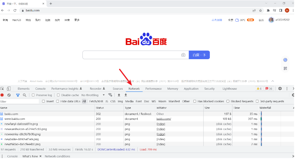- 打开浏览器, 访问http://www.baidu.com, 并右键检查, 选择Network选项卡