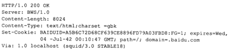 第5~6行:“Set-Cookie: BAIDUID=A5B6C72D68CF639CE8896FD79A03FBD8:FG= 1;expires=Wed, 04 -Ju1-42 00:10:47 GMT;path=/;domain=.baidu.com”表示服务器传送一个Cookie给客户端。其中,“BAIDUID”指定Cookie的名字,"expires” 指定Cookic的生存时间,“domain”和“path"指定该Cookie生效的城名和路径。
