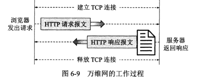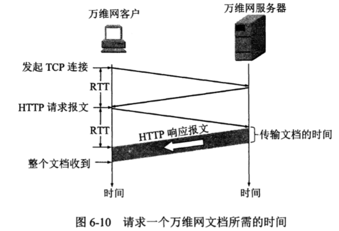 但其实从浏览器请求一个万维网文档到收到整个文档所需的时间(图6-10)。 用户在点击鼠标链接某个万维网文档时,HTTP协议首先要和服务器建立TCP连接。这需要使用三报文握手。当建立TCP连接的三报文握手的前两部分完成后(即经过了一个RTT时间后),万维网客户就把HTTP请求报文,作为建立TCP连接的三报文握手中的第三个报文的数据,发送给万维网服务器。服务器收到HTTP请求报文后,就把所请求的文档作为响应报文返回给客户。