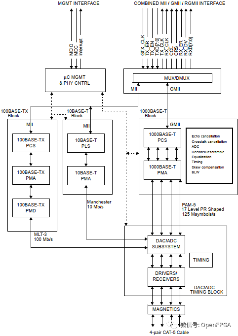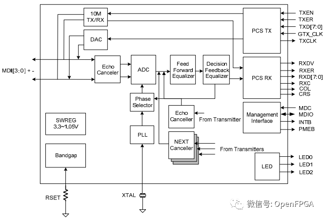 从上图可知,PHY它包含了多个功能模块,功能模块的多少会因需要的不同而有所增减,比如: