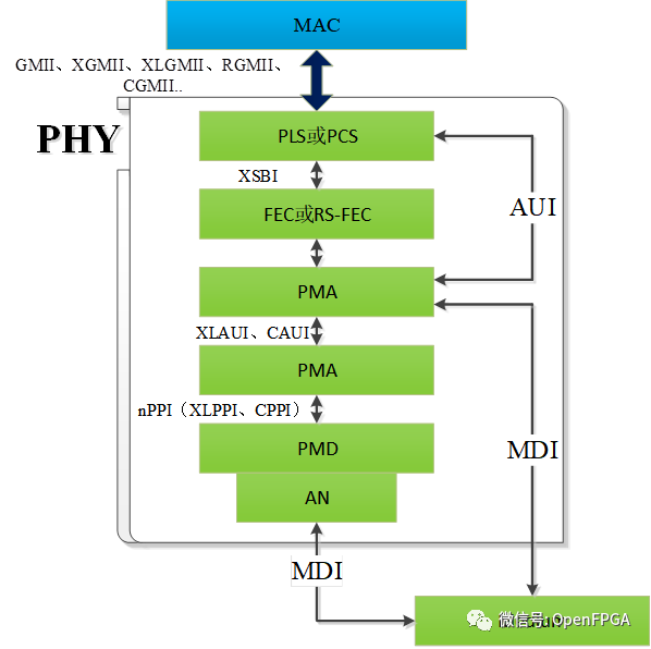 从硬件上来说,一般PHY芯片为模数混合电路,负责接收电、光这类模拟信号,经过解调和A/D转换后通过MII接口将信号交给MAC芯片进行处理。一般MAC芯片为纯数字电路。
