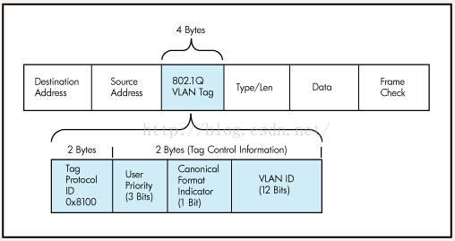 802.1Q定义了vlan的标准,包括type(16bit)、priority(3bit)、cfi(1bit)、vlan(12bit)