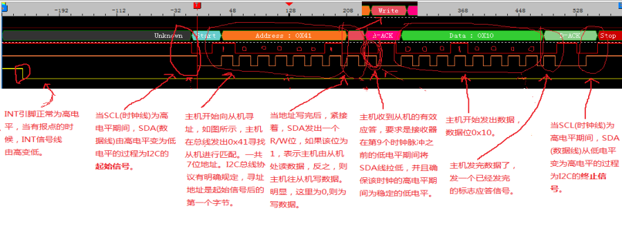 我先来说下上面这幅图具体是什么含义,然后接下来再来说说I2C是怎么操作数据的。I2C总线就是通过SDA总线(数据)、SCL总线(时钟)来传输数据的,那为什么I2C总线上还要接两个上拉电阻呢?根据I2C规格设计上手册上了解到,由于I2C接口设计大多采用的是集电极开路或者是开漏输出的接口,当总线为空闲的时候,两根线均为高电平,由于I2C的SDA和SCL都具有线与功能,什么是线与?线与就是有0为0,同1为1,这是数字电路逻辑相关的了。也就是说只要有一个节点对总线(SCL或者SDA)发送了低电平,那么这整根线就会呈现为低电平,你想想,协议都说了,空闲要高电平,你突然给它来个低电平,这不逗死人嘛?这还叫协议?这明显就是乱搞嘛,是不是?所以既然是协议,那I2C就肯定会有约束条件嘛,这个上拉电阻的其中一个作用就在这里了,给硬件电路的IO口提供一个确定的电平信号。