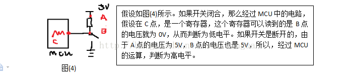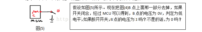 所以,我们可以认为,B点在开关断开的时候,相当于悬空引脚,没有办法确定它的状态,而一般情况下,为了给它确定一个电平,通常就会给IO口加一个上拉电阻,也就是图(4)看到的情况,也就是当按键没按下的时候,B点为高电平,MCU读取B点也为高电平。而当按键按下的时候,则情况相反,这就是上拉电阻的其中一个作用------确定电路的状态。那么下拉电阻也同样是这么一个功能,该怎么分析,就不用我说了,道理是一样的。