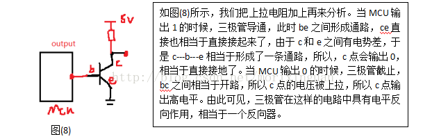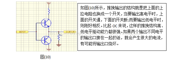 但通常在MCU中,不会这么接,但最终的效果是一样的,原理还是有所区别。于是经过改造就有了如图(10)所示的电路,由两只三极管共同控制,当电平不同的时候,总有一只三极管是导通的,当我把上拉电阻换成开关的时候,这个电路就称为推挽输出电路。