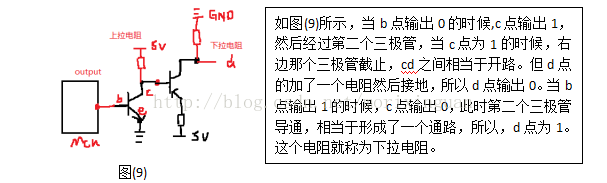 那么怎么解决这么不能确定c点到底输出多少的问题呢?上拉电阻闪亮登场!!!!确定电路状态,这无疑就是个宝贝,关键时刻可以用到了,我们来看看怎么改变它。