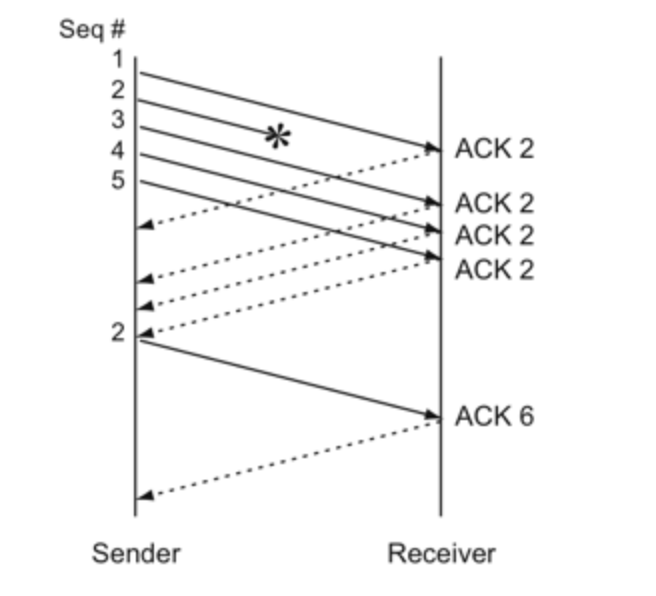 超时间隔加倍会一定程度上提供拥塞控制(持续重传分组会使拥塞更加严重),但也会造成超时周期长的问题(超时间隔指数上升)。发送方通常可在超时事件发生之前通过注意冗余ACK来检测丢包情况,冗余ACK就是再次确认某个报文段的ACK,而发送方先前已经收到过对该报文段的确认。 因为TCP不使用显示否定确认来告诉发送方数据丢失,因此当接收方收到了一个失序数据(序号>期望序号),则向发送方发送一个ACK,该ACK是针对最后一个按序字节的,也就是告诉发送方数据已经失序。