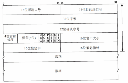 - 4位的首部长度字段(header length field),指示了以32位的字为单位的TCP首部长度。因为选项字段长度不定,所以TCP首部的长度是可变的(通常选项字段为空而TCP首部典型长度就是20字节)。