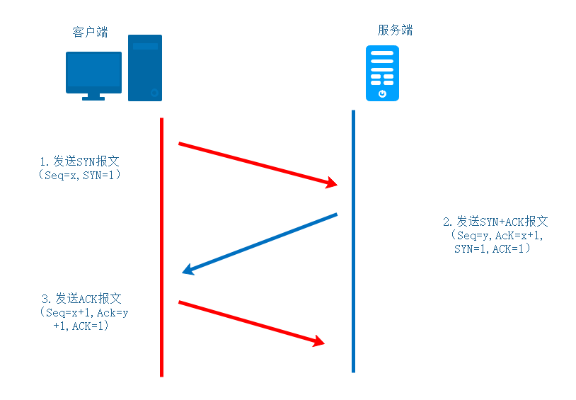 2.服务器端接收到来自客户端的TCP报文之后,结束LISTEN阶段。并返回一段TCP报文。标志位为SYN和ACK,表示“确认客户端的报文Seq序号有效,服务器能正常接收客户端发送的数据,并同意创建新连接”;序号为Seq=y;确认号为Ack=x+1,表示收到客户端的序号Seq并将其值加1作为自己确认号Ack的值。
