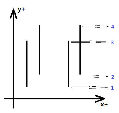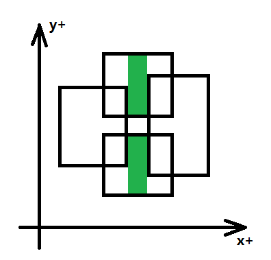 1、是否任意相邻两条垂直x轴的线段之间组成的封闭图形都是矩形呢?答案是否定的,如图四-4-7所示,其中绿色部分为四个矩形的面积并中的某块有效部分,它们同处于两条相邻线段之间,但是中间有空隙,所以它并不是一个完整的矩形。