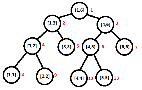 接下来我们关心的就是MAXNODES的取值了,由于线段树是一种二叉树,所以当区间长度为2的幂时,它正好是一棵满二叉树,数组存储的利用率达到最高(即100%),根据等比数列求和可以得出,满二叉树的结点个数为2*n-1,其中n为区间长度(由于C++中数组长度从0计数,编号从1开始,所以MAXNODES要取2*n)。那么是否对于所有的区间长度n都满足这个公式呢?答案是否定的,当区间长度为6时,最大的结点编号为13,而公式算出来的是12(2*6)。