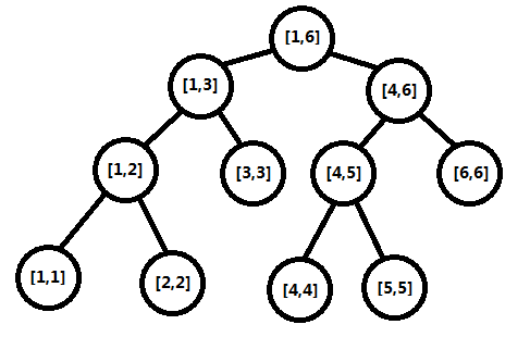 如图二-1-1所示,表示的是一个[1, 6]的区间的线段树结构,每个结点存储一个区间(注意这里的存储区间并不是指存储这个区间里面所有的元素,而是只需要存储区间的左右端点即可),所有叶子结点表示的是单位区间(即左右端点相等的区间),所有非叶子结点(内部结点)都有左右两棵子树,对于所有非叶子结点,它表示的区间为[l, r],那么令mid为(l + r)/2的下整,则它的左儿子表示的区间为[l, mid],右儿子表示的区间为[mid+1, r]。基于这个特性,这种二叉树的内部结点,一定有两个儿子结点,不会存在有左儿子但是没有右儿子的情况。