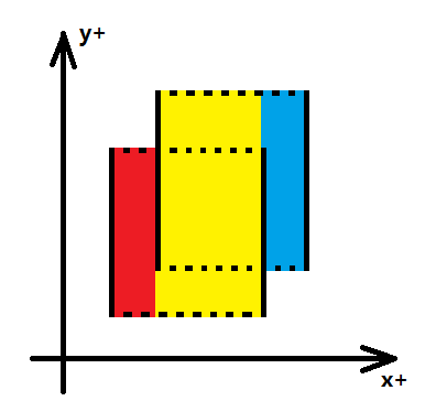 如图四-4-6所示:红色、黄色、蓝色三个矩形分别是3对相邻线段间的矩形面积和,其中红色部分的y方向由<1-2>、<2-3>两个“单位线段”组成,黄色部分的y方向由<1-2>、<2-3>、<3-4>三个“单位线段”组成,蓝色部分的y方向由<2-3>、<3-4>两个“单位线段”组成。特殊的,在计算蓝色部分的时候,<1-2>部分的权值由于第3条线段的插入(第3条线段权值为-1)而变为零,所以不能计入“合法长度”。