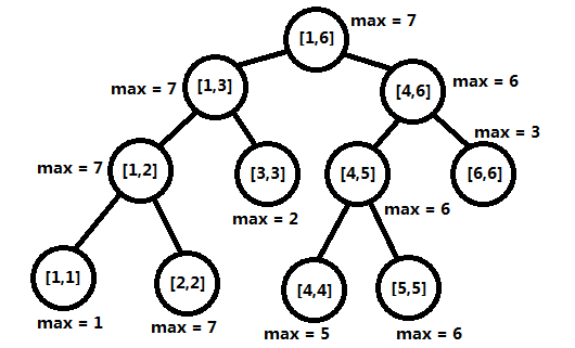 基于这种结构,叶子结点保存一个对应原始数组下标的值,由于树是一个递归结构,两个子结点的区间并正好是父结点的区间,可以通过自底向上的计算在每个结点都计算出当前区间的最大值。