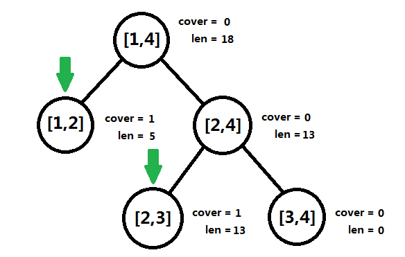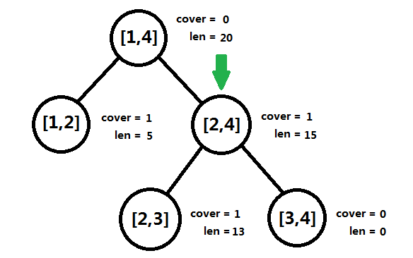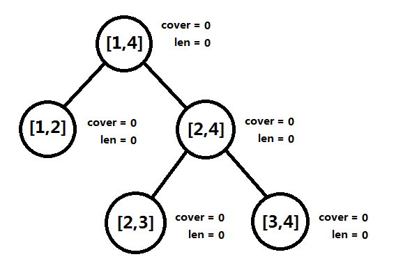 [2, 4]这个结点的cover域为0,所以它的len等于两棵子树的len之和,[1, 4]亦然。