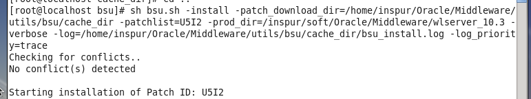 sh bsu.sh -install -patch_download_dir=/home/inspur/Oracle/Middleware/utils/bsu/cache_dir -patchlist=U5I2 -prod_dir=/inspur/soft/Oracle/Middleware/wlserver_10.3 -verbose -log=/home/inspur/Oracle/Middleware/utils/bsu/cache_dir/bsu_install.log -log_priority=trace