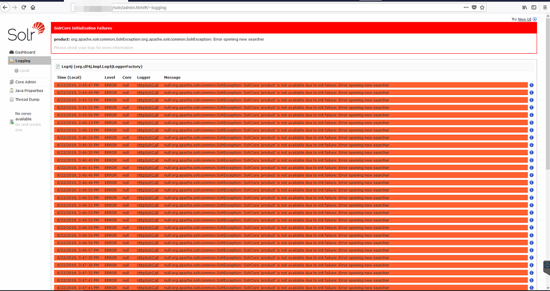 org.springframework.web.util.NestedServletException: Request processing failed; nested exception is org.springframework.data.solr.UncategorizedSolrException: Error from server at http://192.168.1.95:8088/solr/product: Expected mime type application/octet-stream but got text/html. <!DOCTYPE html><html><head><title>Apache Tomcat/8.0.30 - Error report</title><style type="text/css">H1 {font-family:Tahoma,Arial,sans-serif;color:white;background-color:#525D76;font-size:22px;} H2 {font-family:Tahoma,Arial,sans-serif;color:white;background-color:#525D76;font-size:16px;} H3 {font-family:Tahoma,Arial,sans-serif;color:white;background-color:#525D76;font-size:14px;} BODY {font-family:Tahoma,Arial,sans-serif;color:black;background-color:white;} B {font-family:Tahoma,Arial,sans-serif;color:white;background-color:#525D76;} P {font-family:Tahoma,Arial,sans-serif;background:white;color:black;font-size:12px;}A {color : black;}A.name {color : black;}.line {height: 1px; background-color: #525D76; border: none;}</style> </head><body><h1>HTTP Status 500 - {metadata={error-class=org.apache.solr.common.SolrException,root-error-class=java.nio.file.FileSystemException},msg=SolrCore 'product' is not available due to init failure: Error opening new searcher,trace=org.apache.solr.common.SolrException: SolrCore 'product' is not available due to init failure: Error opening new searcher