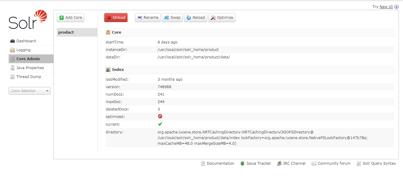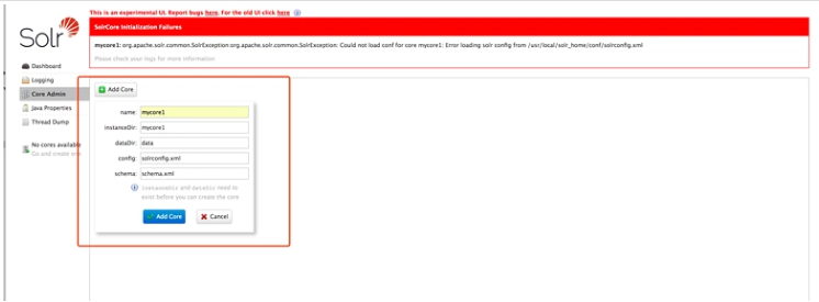 只显示让添加 并没有显示已存在的,默认添加的表单上name,instanceDir 填写的是new_core这里要根据你自己的目录名称来填写例如我的是/usr/local/solr/solr_home/product/conf/solrconfig.xml 我的名字为product 这里两个参数填写product