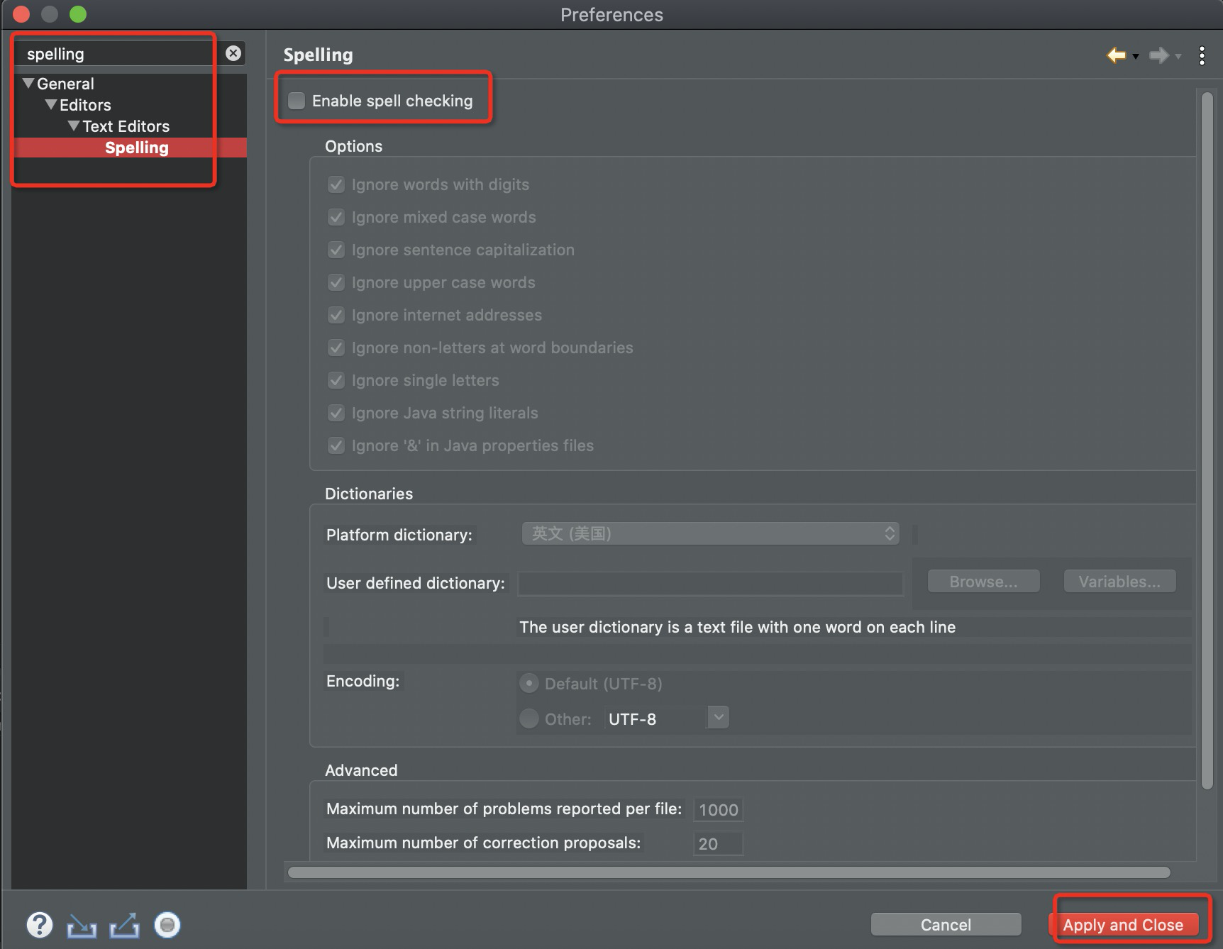 (3)在左侧栏顶部搜索”spelling”,找到spelling后取消拼写检查的选项(因为Eclipse的拼写检查比较弱智):