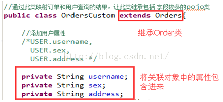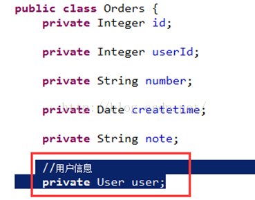 2) 在orders类中添加User属性,将关联查询出来的用户信息映射到orders对象中的user属性中。