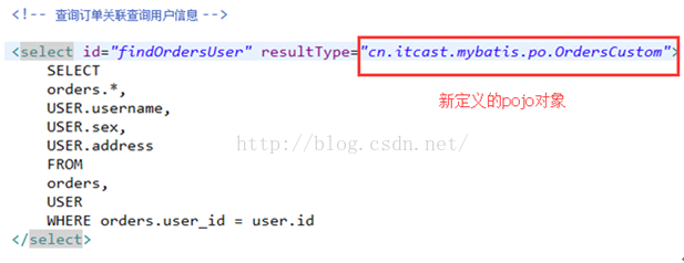 2. 在mapper.xml相应的sql语句配置中,输出类型为上边定义的pojo对象。其他照旧。