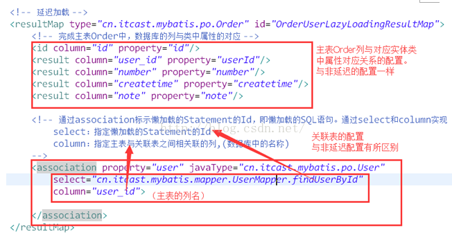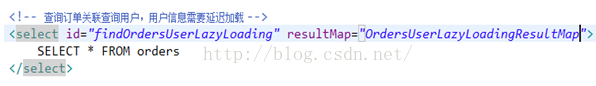 4) 将这两个statement通过resultMap关联起来:上边先去执行findOrdersUserLazyLoading,当需要去查询用户的时候再去执行findUserById。配置延迟加载的resultMap。
