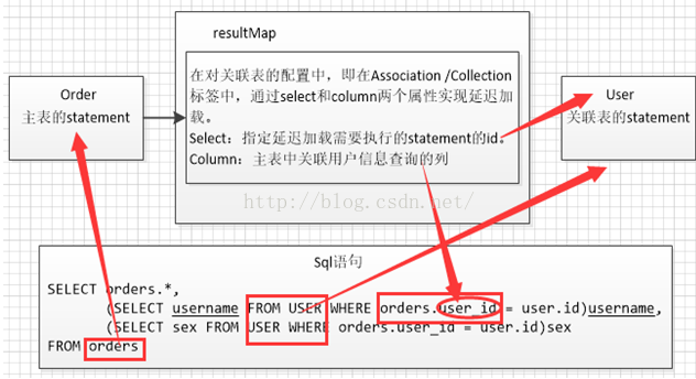 2) 然后在需要时加载User表中orders.user_id = user.id项中的username和sex。