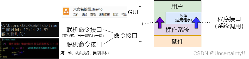 命令接口、程序接口(系统调用)、库函数