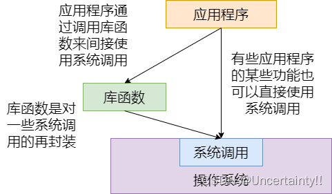 注意:有些库函数涉及系统调用,而有些库函数不涉及系统调用