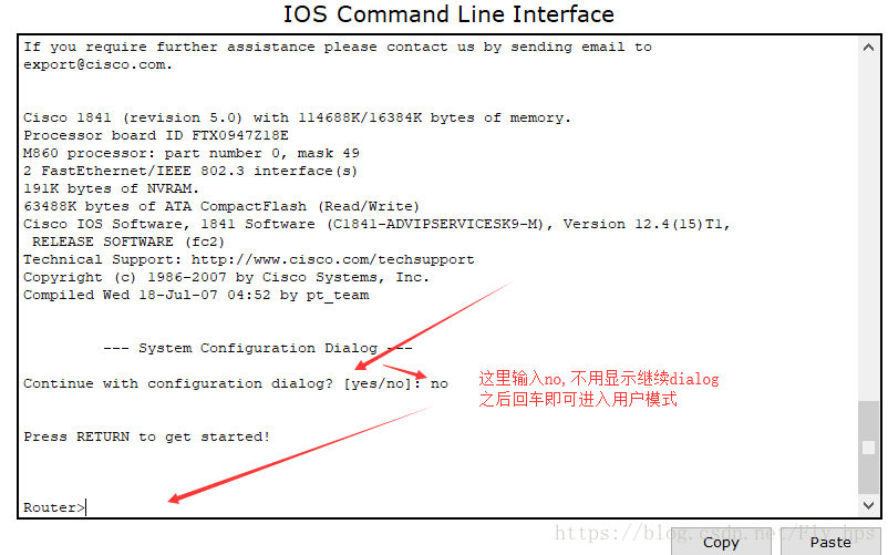 (1)第一次启动成功之后,Cisco路由器会出现用户模式提示符router>