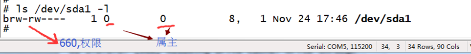 输入ls /dev/sda1 -l,可以看到都是通过mdev.conf里配置信息来创建的设备节点,如下图所示:
