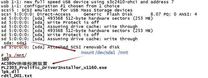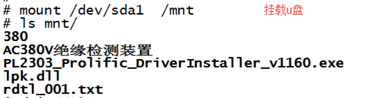 而想使用上面的sda1设备节点,读写数据时,还需要使用mount /dev/sda1 /mnt,来挂载u盘才行,会显得非常麻烦,如下图所示:
