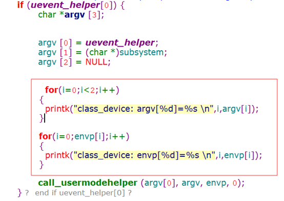 int kobject_uevent_env(struct kobject *kobj, enum kobject_action action,char *envp_ext[]) { char **envp; char *buffer; char *scratch; int i = 0; ... ... /* 通过KOBJ_ADD获取字符串"add",所以action_string="add" */ action_string = action_to_string(action); // action=KOBJ_ADD /* environment index */ envp = kzalloc(NUM_ENVP * sizeof (char *), GFP_KERNEL); //分配一个环境变量索引值 /* environment values */ buffer = kmalloc(BUFFER_SIZE, GFP_KERNEL); //分配一个环境变量缓冲值 /* event environemnt for helper process only */ /*设置环境变量*/ envp[i++] = "HOME=/"; envp[i++] = "PATH=/sbin:/bin:/usr/sbin:/usr/bin"; scratch = buffer; envp [i++] = scratch; scratch += sprintf(scratch, "ACTION=%s", action_string) + 1; //"ACTION= add" envp [i++] = scratch; scratch += sprintf (scratch, "DEVPATH=%s", devpath) + 1; envp [i++] = scratch; scratch += sprintf(scratch, "SUBSYSTEM=%s", subsystem) + 1; ... ... /*调用应用程序,比如mdev*/ if (uevent_helper[0]) { char *argv [3]; argv [0] = uevent_helper; // uevent_helper[]= "/sbin/hotplug"; argv [1] = (char *)subsystem; argv [2] = NULL; call_usermodehelper (argv[0], argv, envp, 0); //调用应用程序,根据传入的环境变量参数来创建设备节点 } }