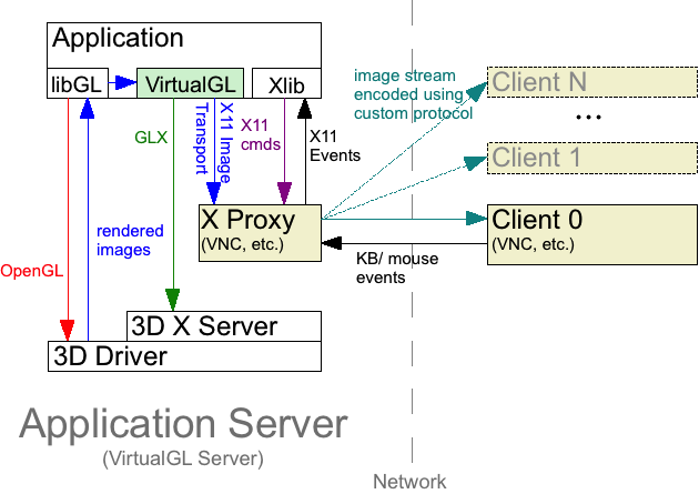 “VirtualGL is an open source package which gives any Unix or Linux remote display software the ability to run OpenGL applications with full 3D hardware acceleration…..With VirtualGL, the OpenGL commands and 3D data are instead redirected to a 3D graphics accelerator on the application server, and only the rendered 3D images are sent to the client machine……” For more information seeWhat is VirtualGL? from Project Website