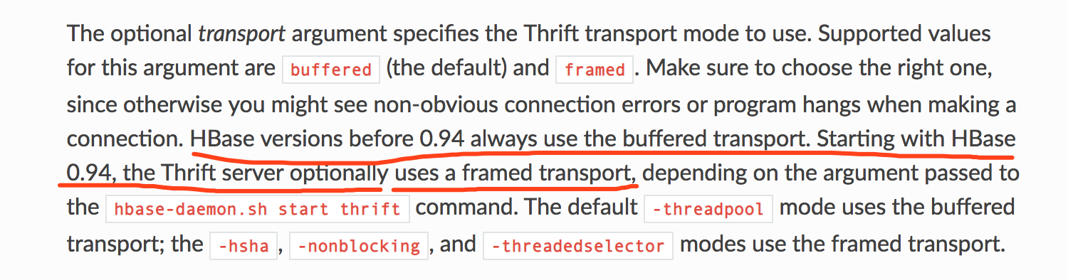 hbase由于版本不同,transport的参数值也会有不同,hbase 0.94之前,transport参数应该设置为buffered,hbase 0.94之后,transport参数应该设置为framed,transport默认为buffered,所以如果hbase版本为0.94以后,需要设置该参数为framed,如下: