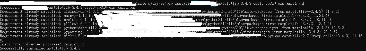 原来我还没有安装matplotlib,所以它在安装wordcloud过程时需要matplotlib安装,但它在安装时与我的python版本不一致,它的是3.43,而我的python是310,怎么办?这不就是和wordcloud出现的情况一样吗!?于是在我们上面的网站 “https://www.lfd.uci.edu/~gohlke/pythonlibs/#wordcloud”下载matplotlib310版,然后按照大神的三部曲安装,