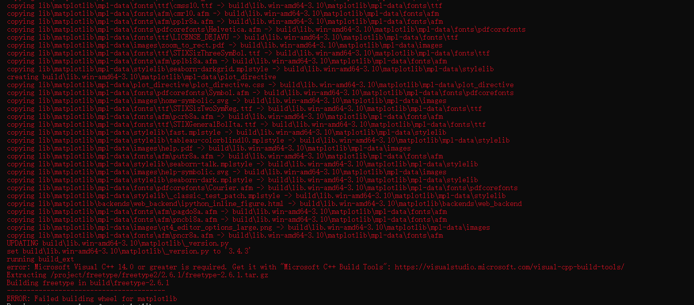 一出现就惊了,这一大串的红字太吓人了吧!?一时间不知该如何是好。不过我们学了编程之后都知道出错了就要逐步找bug,于是我就冷静下来,喝了口水,开始看这些红字是什么玩意。发现最后出现的错误提示:error: Microsoft Visual C++ 14.0 or greater is required. Get it with "Microsoft C++ Build Tools": https://visualstudio.microsoft.com/visual-cpp-build-tools/