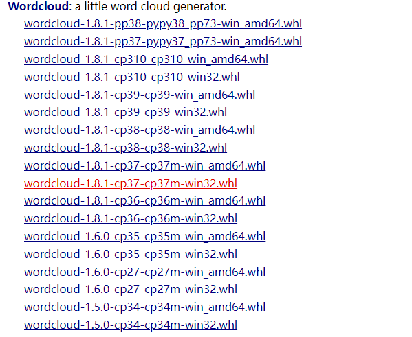 1.首先去“https://www.lfd.uci.edu/~gohlke/pythonlibs/#wordcloud”下载了wordcloud.whl文件
