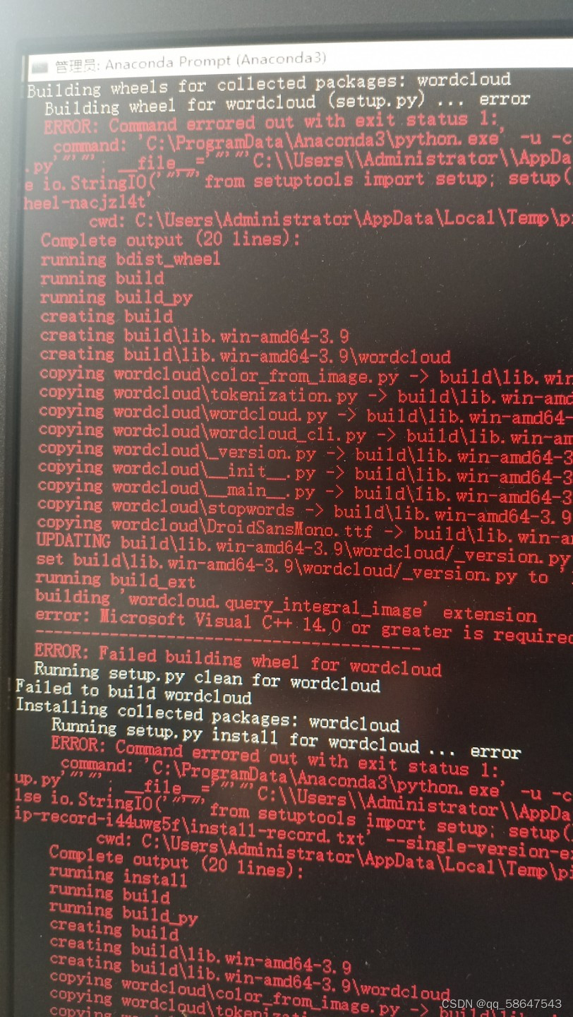 如果直接在anaconda prompt中用命令pip install wordcould报错