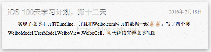 第十三天,完善微博视图。添加时间和来源,初步学习了正则表达式,并且实现了微博内容的字符串匹配和替换。从而实现微博内容里面链接的高亮和点击。(P.S.复习了斯坦福大学CS193P的课程:多线程Multithreading、Lecture 10的Demo